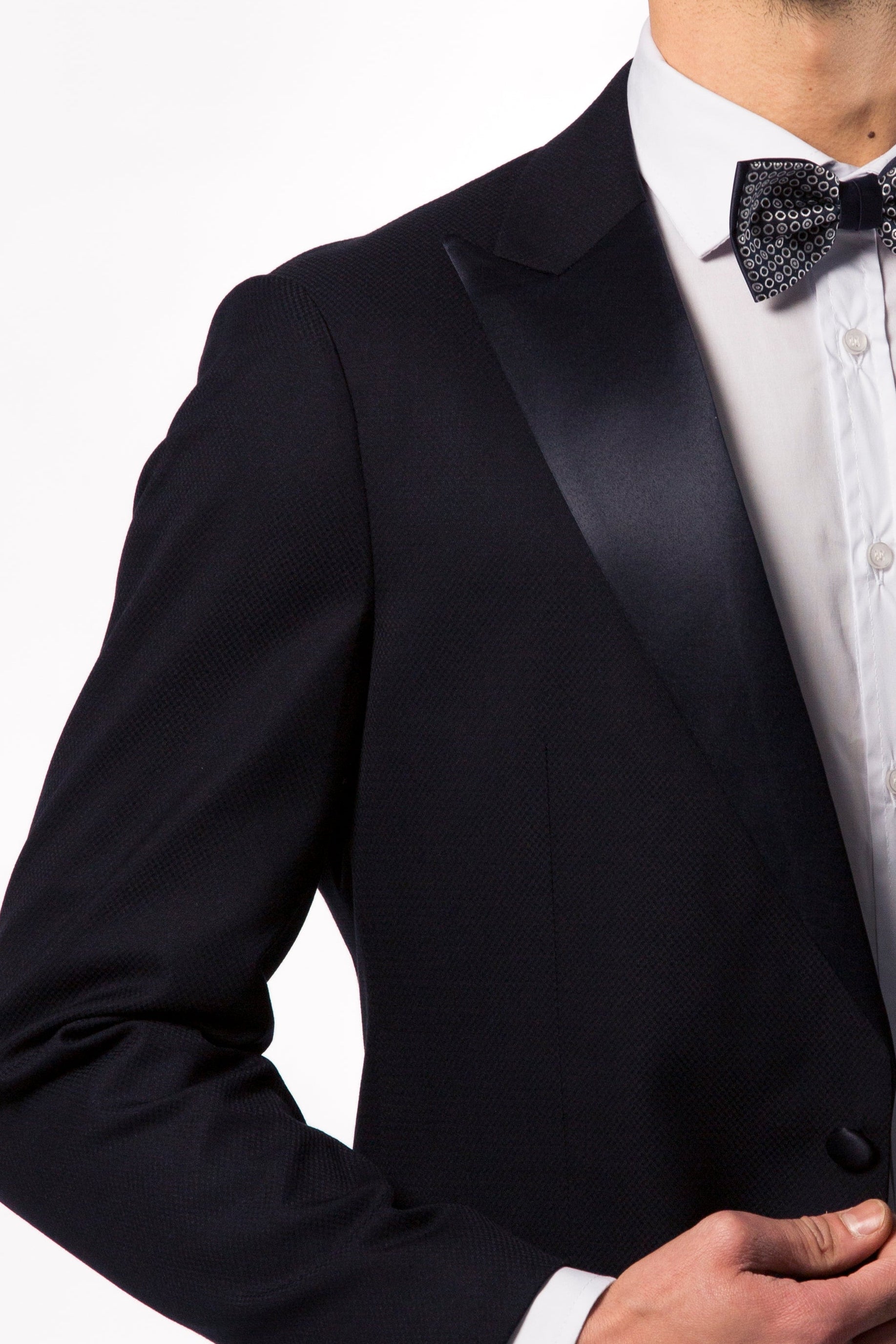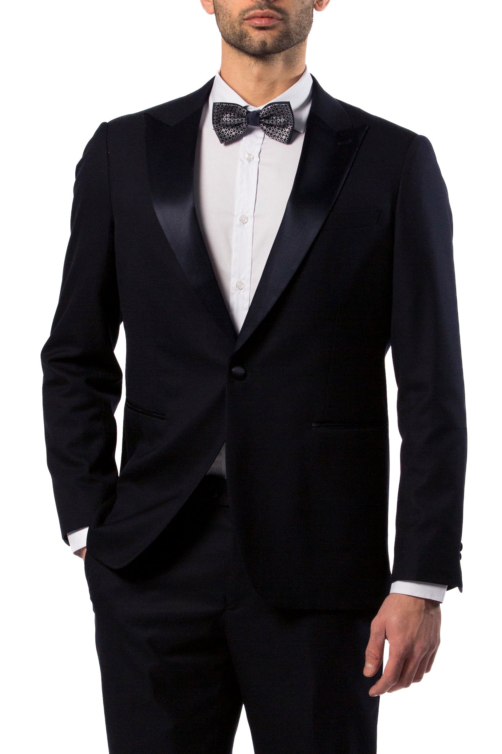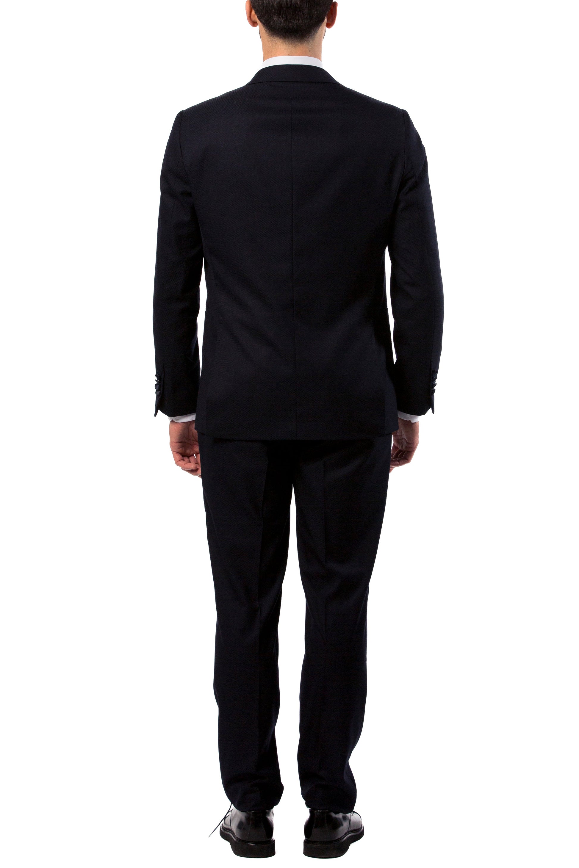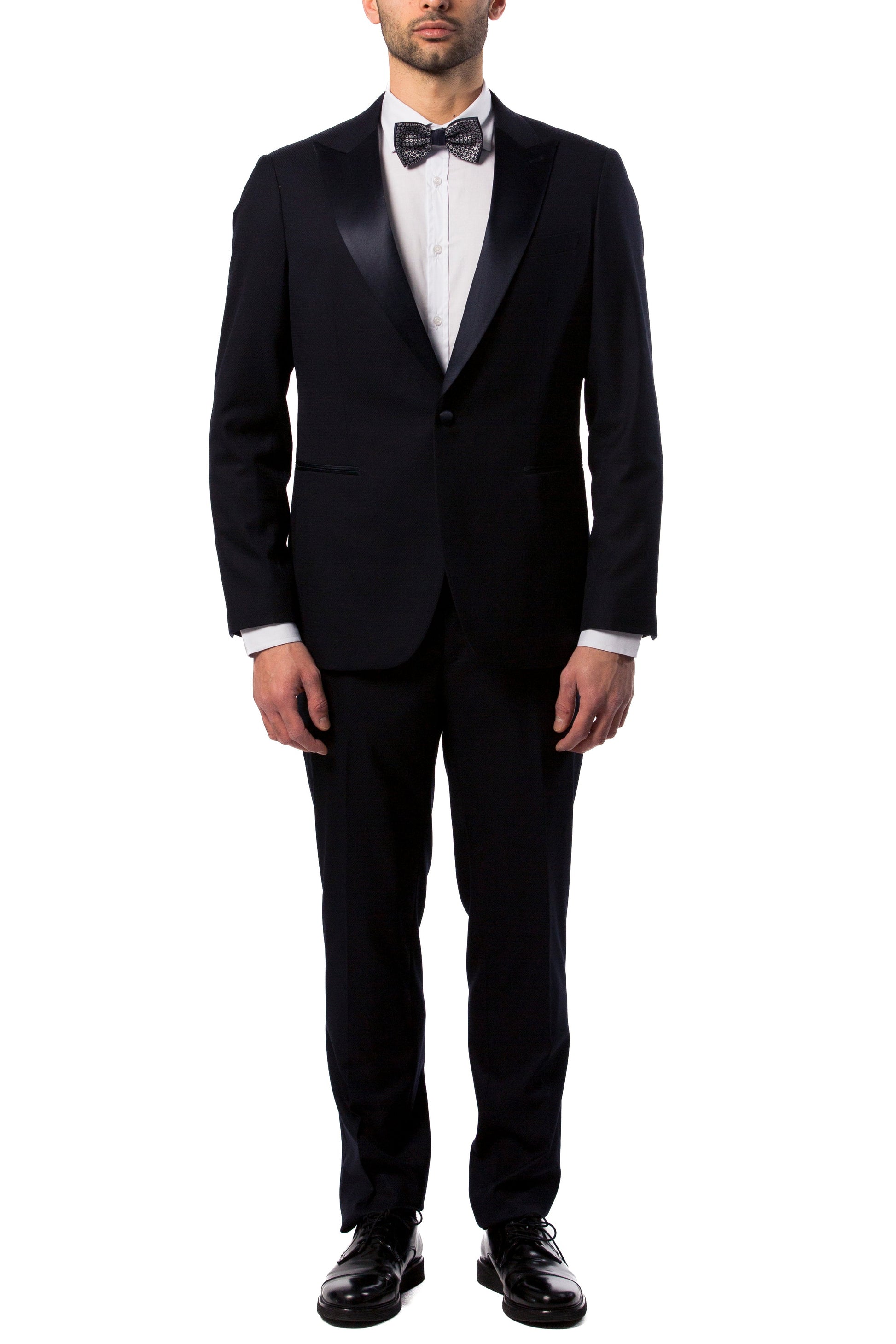 Abito da uomo blu notte con rever a lancia in raso.