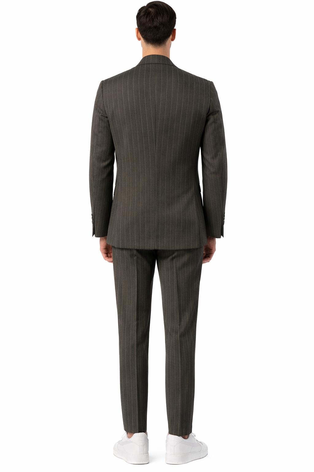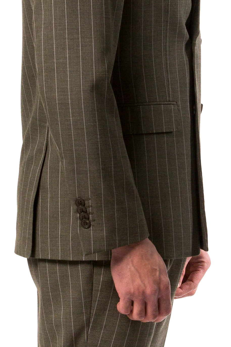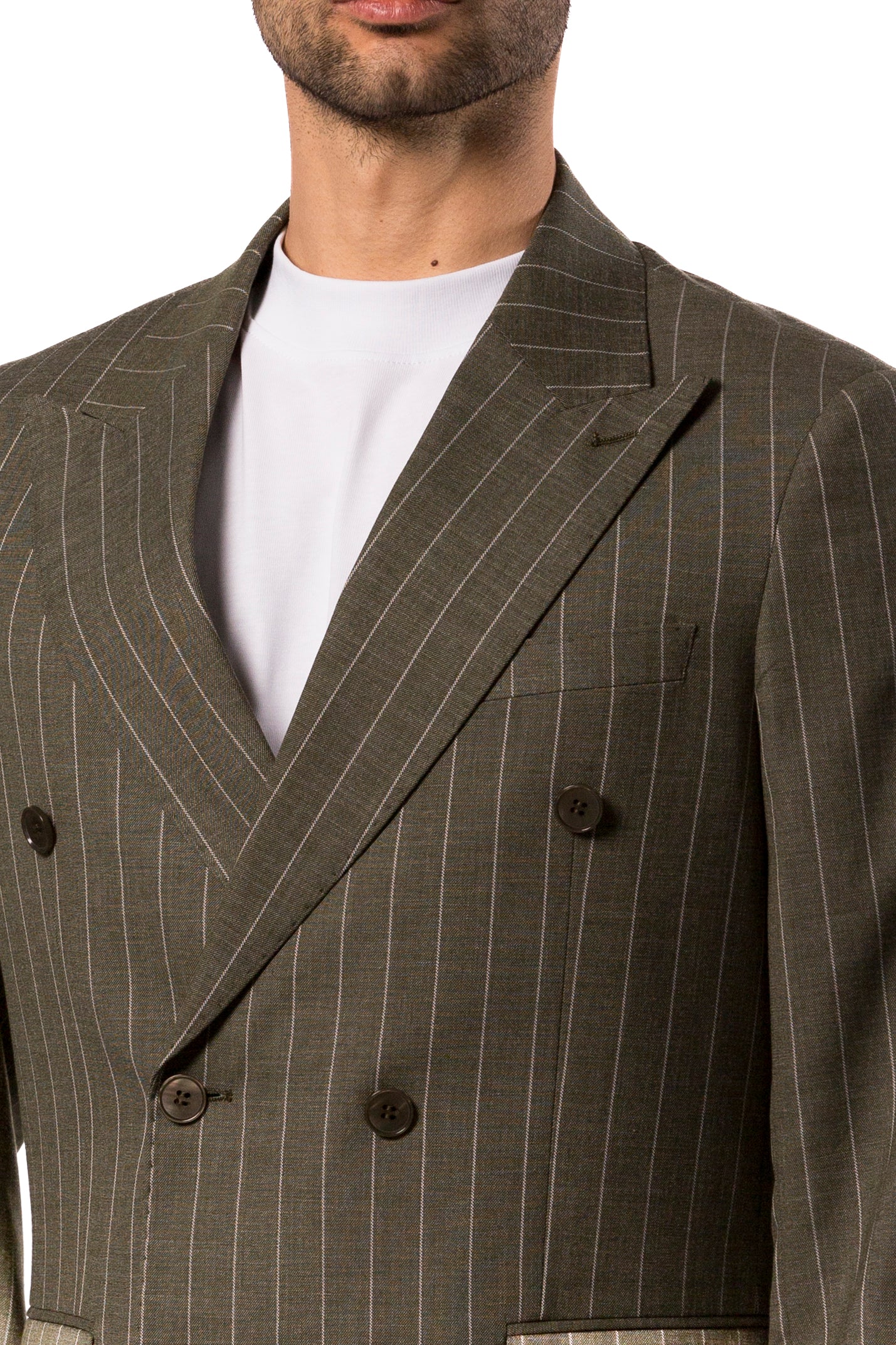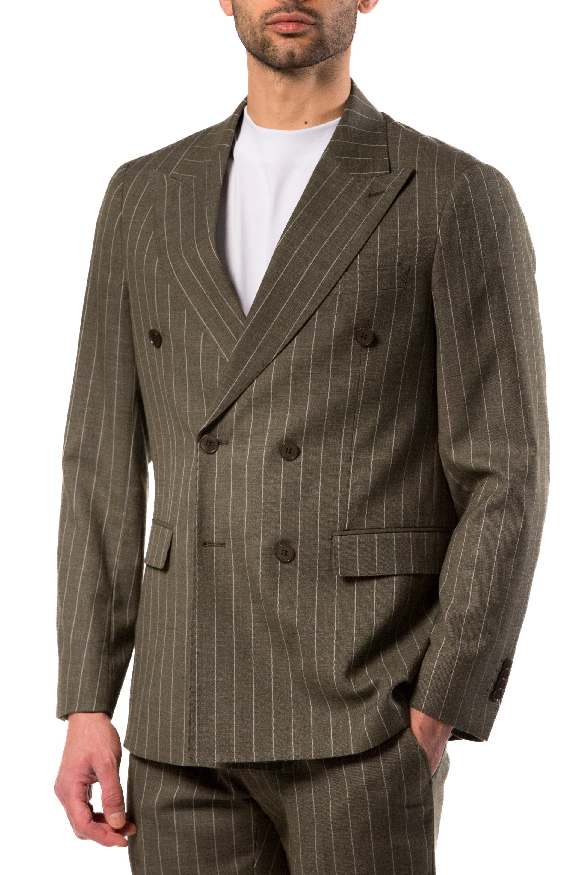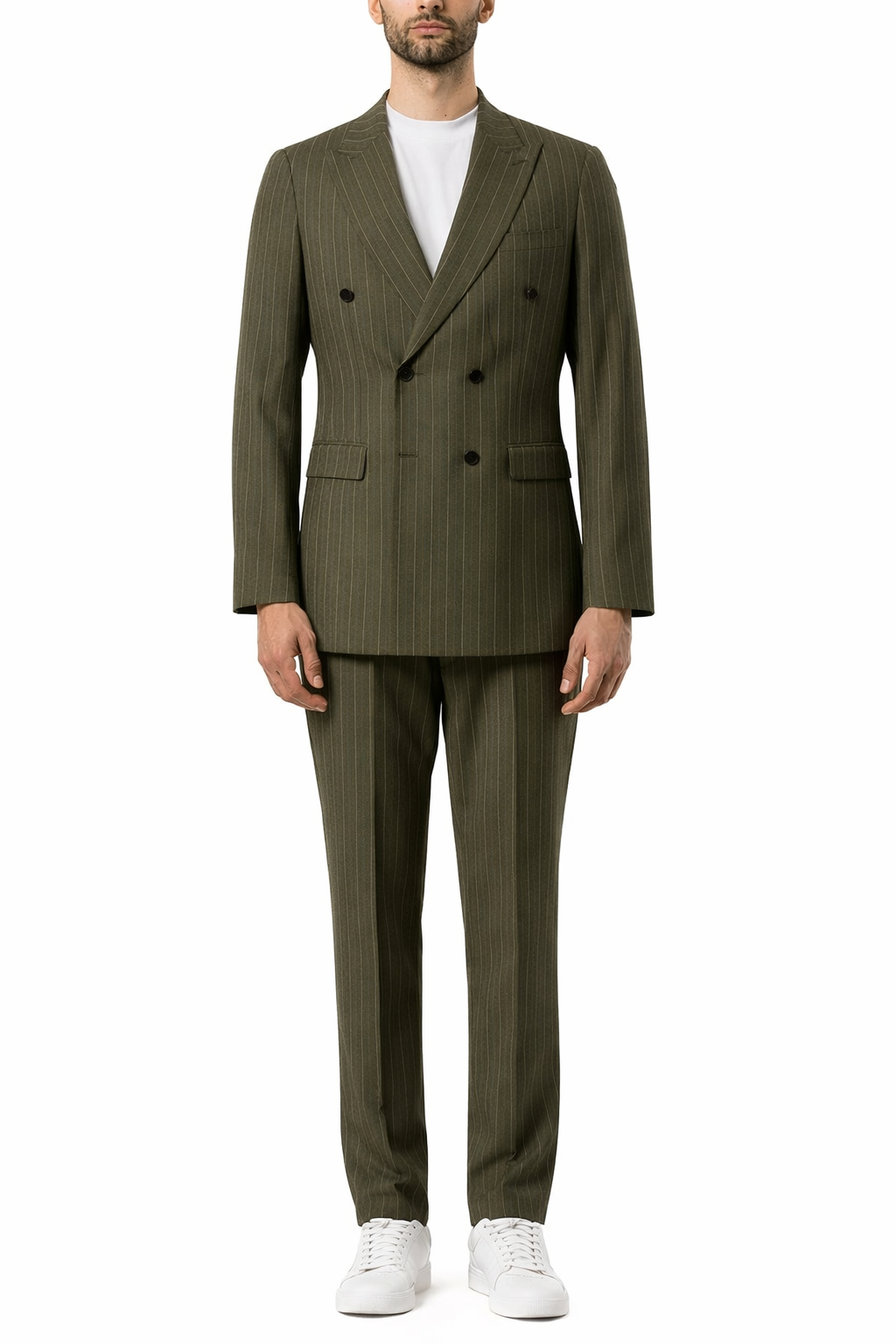 Abito da uomo verde gessato dal taglio doppiopetto.